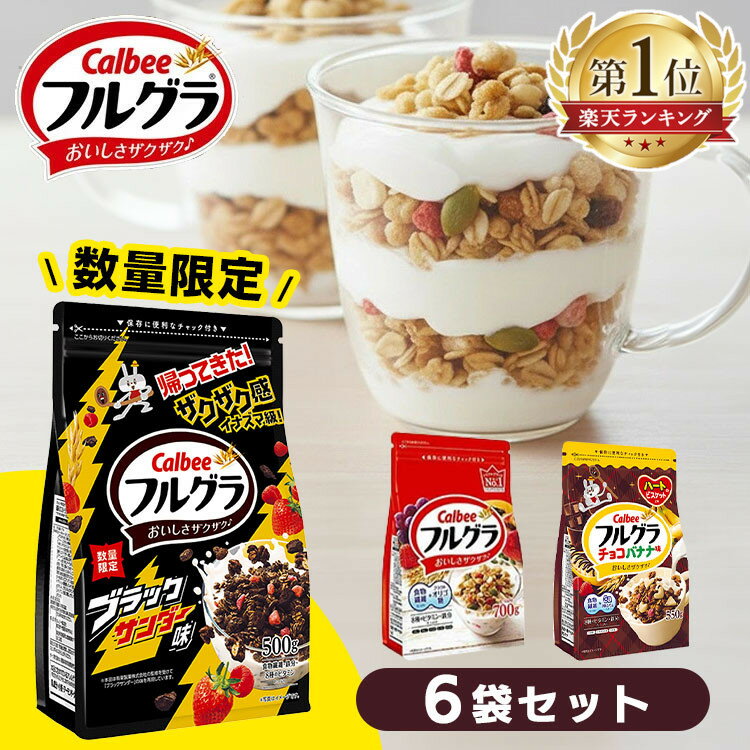 ●内容量550g●原材料オーツ麦(オーストラリア又はフィンランド又はその他)、小麦粉、ライ麦粉、砂糖、植物油、米粉、デキストリン、ビスケット(小麦粉、砂糖、ショートニング、ぶどう糖果糖液糖、マーガリン、食塩)、コーンフラワー、水溶性食物繊維、ココナッツ、乾燥バナナ、ココアパウダー、ラズベリー加工品、アーモンドパウダー、食塩、玄米粉、小麦ふすま、チョコレート(大豆を含む)、乳糖 / 乳酸カルシウム、香料、酸味料、ピロリン酸鉄、セルロース、酸化防止剤(ビタミンE)、炭酸カルシウム、乳化剤、膨脹剤、クエン酸Na、ナイアシン、パントテン酸Ca、ビタミンA、ビタミンB6、ビタミンB1、着色料(アントシアニン、カロチノイド)、葉酸、ビタミンD、ビタミンB12●成分(1食分50g当たり)エネルギー215kcal、たんぱく質3.4g、脂質6.6g、コレステロール0mg、炭水化物37.8g (糖質33.3g、食物繊維4.5g)、食塩相当量0.3g、カルシウム53mg、鉄5.0mg、ビタミンA 257?g、ビタミンD 1.84?g、ビタミンB1 0.40mg、ナイアシン4.4mg、ビタミンB6 0.44mg、ビタミンB12 0.80?g、葉酸80?g、パントテン酸1.6mg●アレルギー物質乳成分・小麦・アーモンド・大豆・バナナ■フルグラ ブラックサンダー味ビスケットのザクザク食感も楽しめるブラック(黒)なグラノーラに、ブラックサンダーのココアクッキーをトッピングフルグラとブラックサンダー両方のおいしさとザクザク食感を朝から楽しめます●内容量500g●原材料オーツ麦(オーストラリア又はフィンランド又はその他)、小麦粉、砂糖、ココアクッキー、ココナッツ、植物油、米粉、ライ麦粉、デキストリン、コーンフラワー、ビスケット(大豆を含む)、水溶性食物繊維、ココアパウダー、乾燥いちご、ラズベリー加工品、食塩、玄米粉、チョコレート、小麦ふすま、アーモンドミルク、乳糖 / 香料、甘味料(ソルビトール)、膨脹剤、酸味料、セルロース、ピロリン酸鉄、酸化防止剤(ビタミンE、ローズマリー抽出物)、加工デンプン、乳化剤、ナイアシン、pH調整剤、パントテン酸Ca、ビタミンA、ビタミンB6、ビタミンB1、アントシアニン色素、葉酸、ビタミンD、ビタミンB12●成分(1食分50g当たり)エネルギー226kcal、たんぱく質:3.7g、脂質:8.5g、炭水化物:35.6g、糖質:31.6g、食物繊維総量:4.0g、食塩相当量:0.4g、カルシウム:12mg、鉄:5.0mg、ビタミンA:257μg、ビタミンD:1.84μg、ビタミンB1:0.40mg、ナイアシン当量:4.4mg、ビタミンB6:0.44mg、ビタミンB12:0.80μg、葉酸:80μg、パントテン酸:1.6mg、コレステロール:0mg●アレルギー物質乳成分・小麦・アーモンド・大豆■共通●原産国日本●保存方法直射日光の当たる所、高温多湿の所での保存はさけてください。