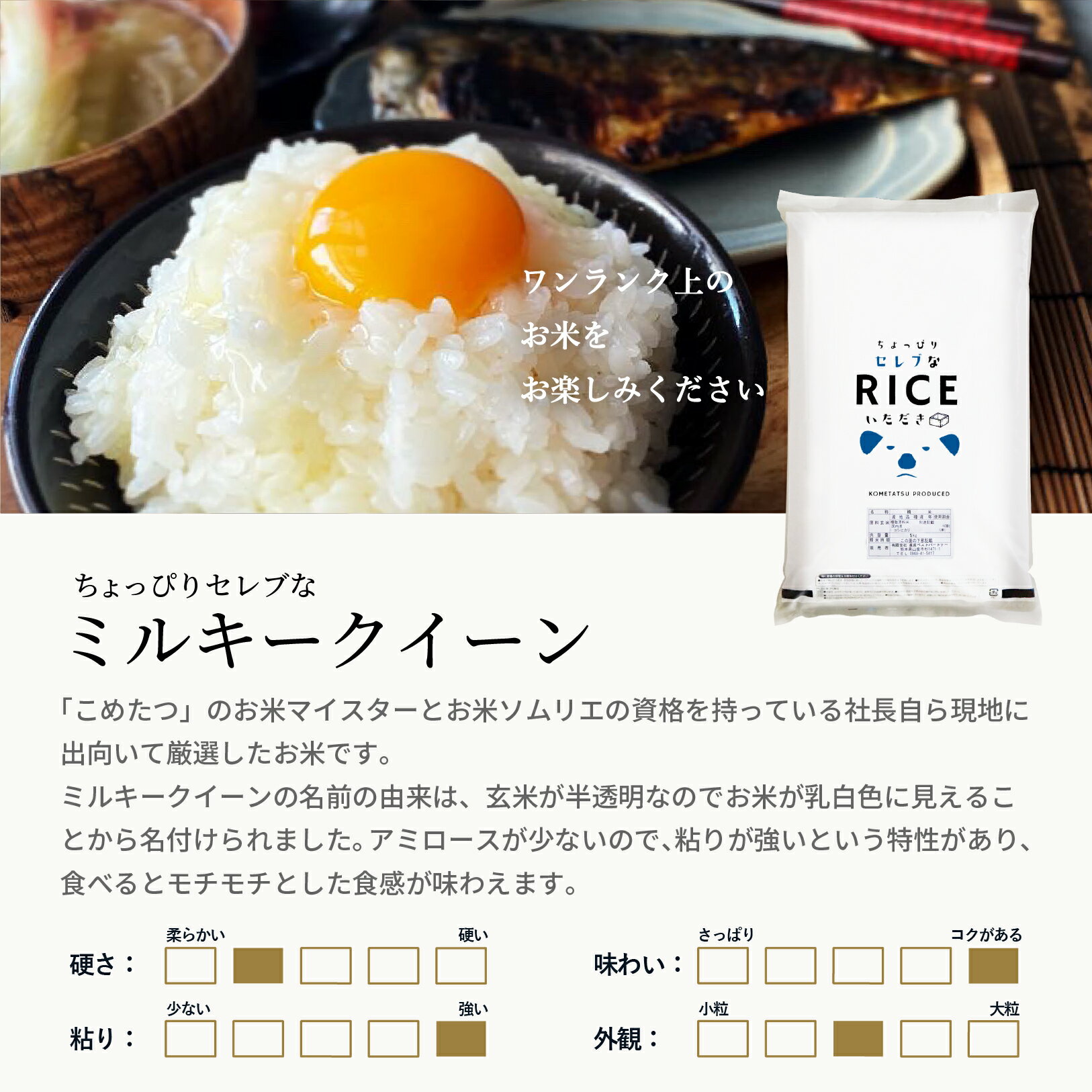 ちょっぴりセレブなミルキークイーン、その他のサイズはこちら▼・5kg ・10kg ・20kg・30kg商品名ちょっぴりセレブなミルキークイーン30kg名称玄米又は精米原料玄米:産地熊本県、千葉県、栃木県、茨城県、静岡県のいずれか※その時々で最良の品質をお届けするため、上記以外の産地が入る可能性がございます。