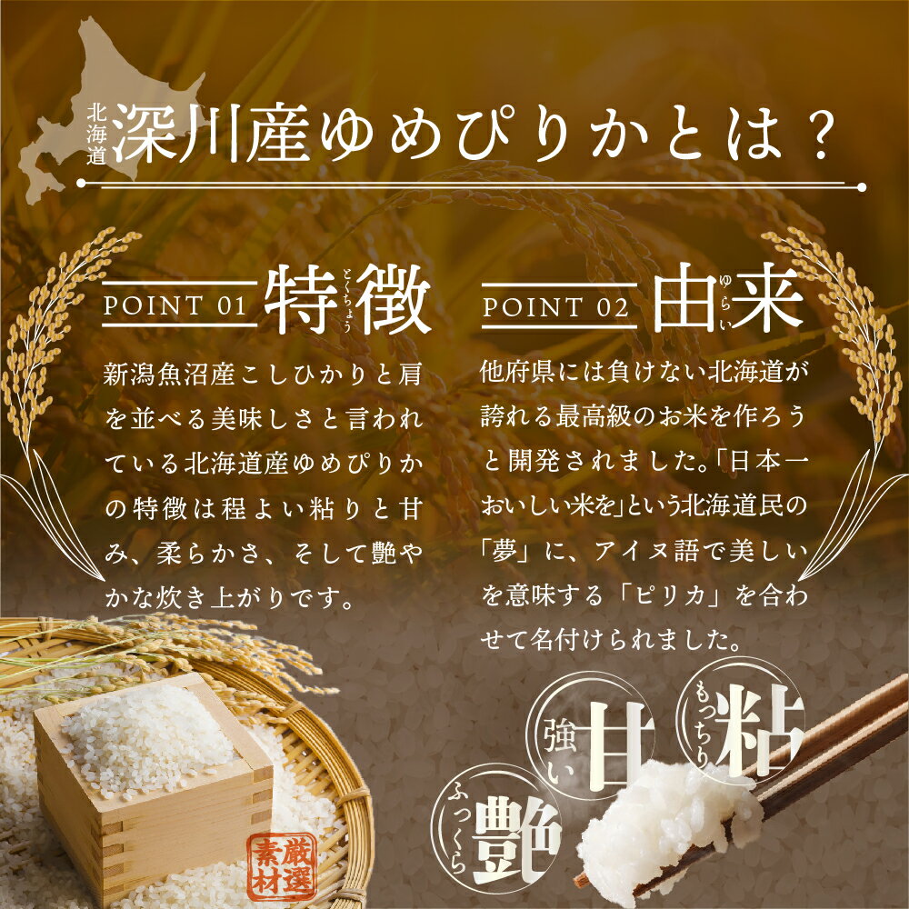 北海道産ゆめぴりかの特徴は程よい粘りと甘み、柔らかさ、そして艶やかな炊き上がりです。