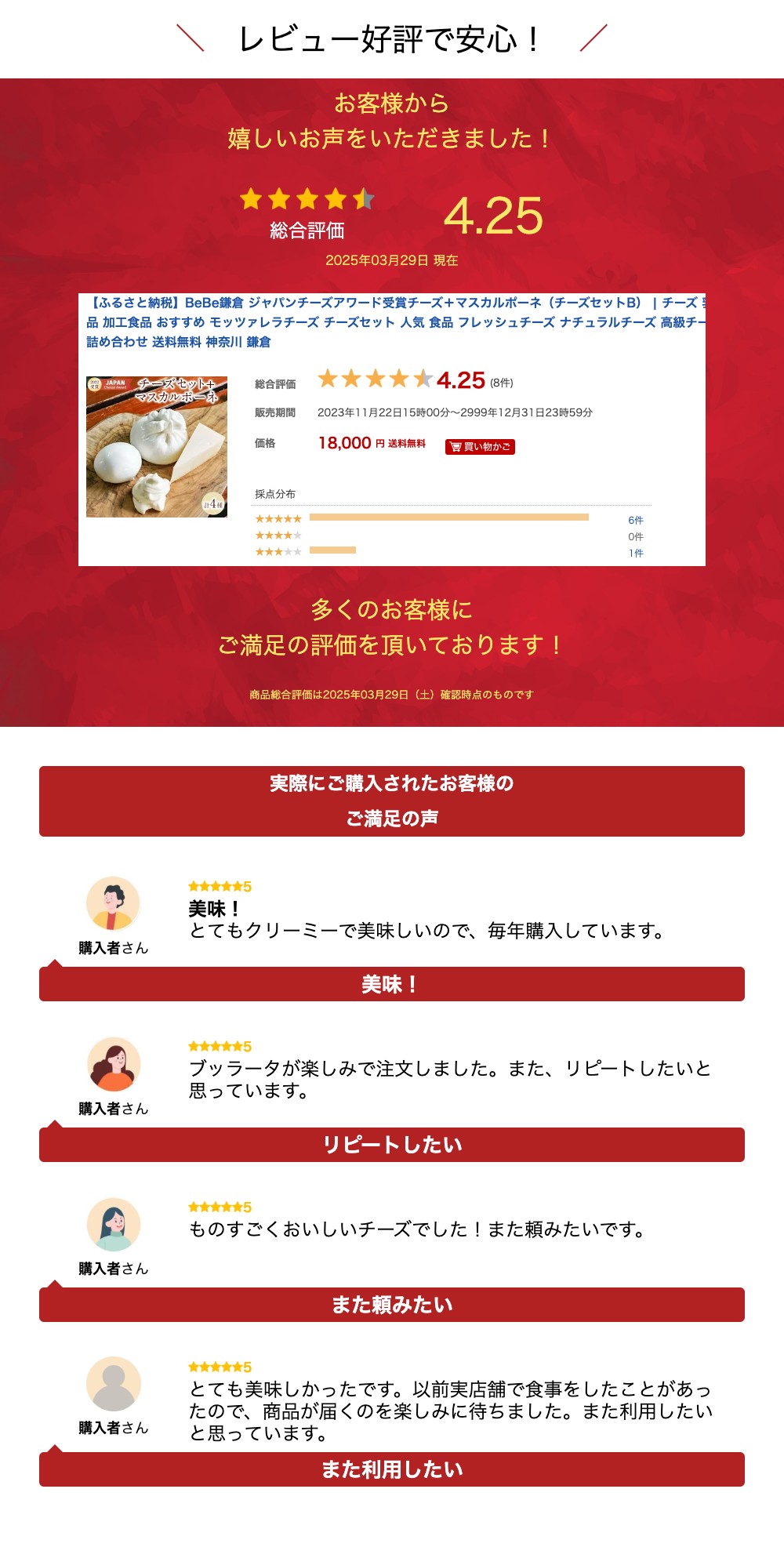 名称 BeBe鎌倉 ジャパンチーズアワード受賞チーズ+マスカルポーネ(チーズセットB) 原材料名 ・モッツァレラチーズ:生乳、塩 ・ブッラータ:生乳、塩、生クリーム ・マスカルポーネ:生クリーム、グラニュー糖、レモン汁 ・ゴーダカマクラ:生乳・塩 賞味期限 ・モッツァレラチーズ:製造日より7日 ・ブッラータ:製造日より5日 ・マスカルポーネ:製造日より10日 ・ゴーダカマクラ:包装から3週間 保存方法 要冷蔵(10℃以下) 製造者 株式会社Latteria BeBe 神奈川県鎌倉市御成町11-17 事業者情報 事業者名 Latteria BeBe 連絡先 0467-81-3440 営業時間 11:00〜22:00 定休日 月曜 ※その他不定休あり 関連商品【ふるさと納税】BeBe鎌倉 ジャパンチーズアワード受賞チーズセット+...【ふるさと納税】北鎌倉燻煙工房『スモーク商品フルセット』 | 納税 楽...【ふるさと納税】北鎌倉燻煙工房『スモークチーズとスモーク調味料セット』...12,000円36,000円24,000円【ふるさと納税】北鎌倉燻煙工房『スモークチーズとナッツ商品セット』 |...【ふるさと納税】北鎌倉燻煙工房『スモーク商品フルセット特盛』 | 納税...【ふるさと納税】蝶矢梅キットLサイズ(6杯分) 完熟南高×こんぺい糖...24,000円48,000円18,000円【ふるさと納税】バケットハットロングTシャツ BLACK 【KEYME...【ふるさと納税】《3》バケットハットロングTシャツ WHITE 【KE...【ふるさと納税】《3》セーラー帽イラストロングTシャツ BLACK 【...18,000円18,000円18,000円「ふるさと納税」寄付金は、下記の事業を推進する資金として活用してまいります。