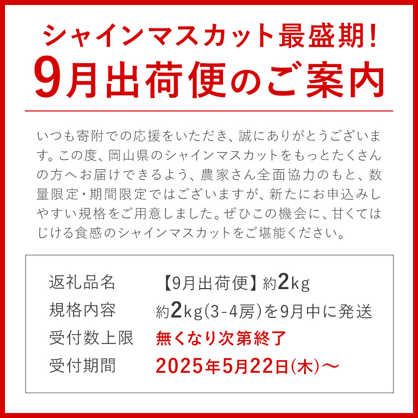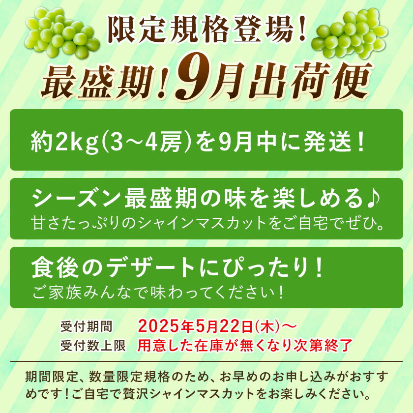 商品情報 【厳選】岡山県産 シャインマスカット 名称 シャインマスカット 内容量 【選べる内容量】 ・約650g(1房入り) ・約1.3kg(2房入り) ・約2kg(3〜4房入り) ・約2.6kg(3〜5房入り) ・計約2.6kg(約1.3kg×2ヶ月定期便) ・約3kg(4〜6房入り) ・約5kg(6〜10房入り) ※気候条件により、まれに種がある場合がございます。