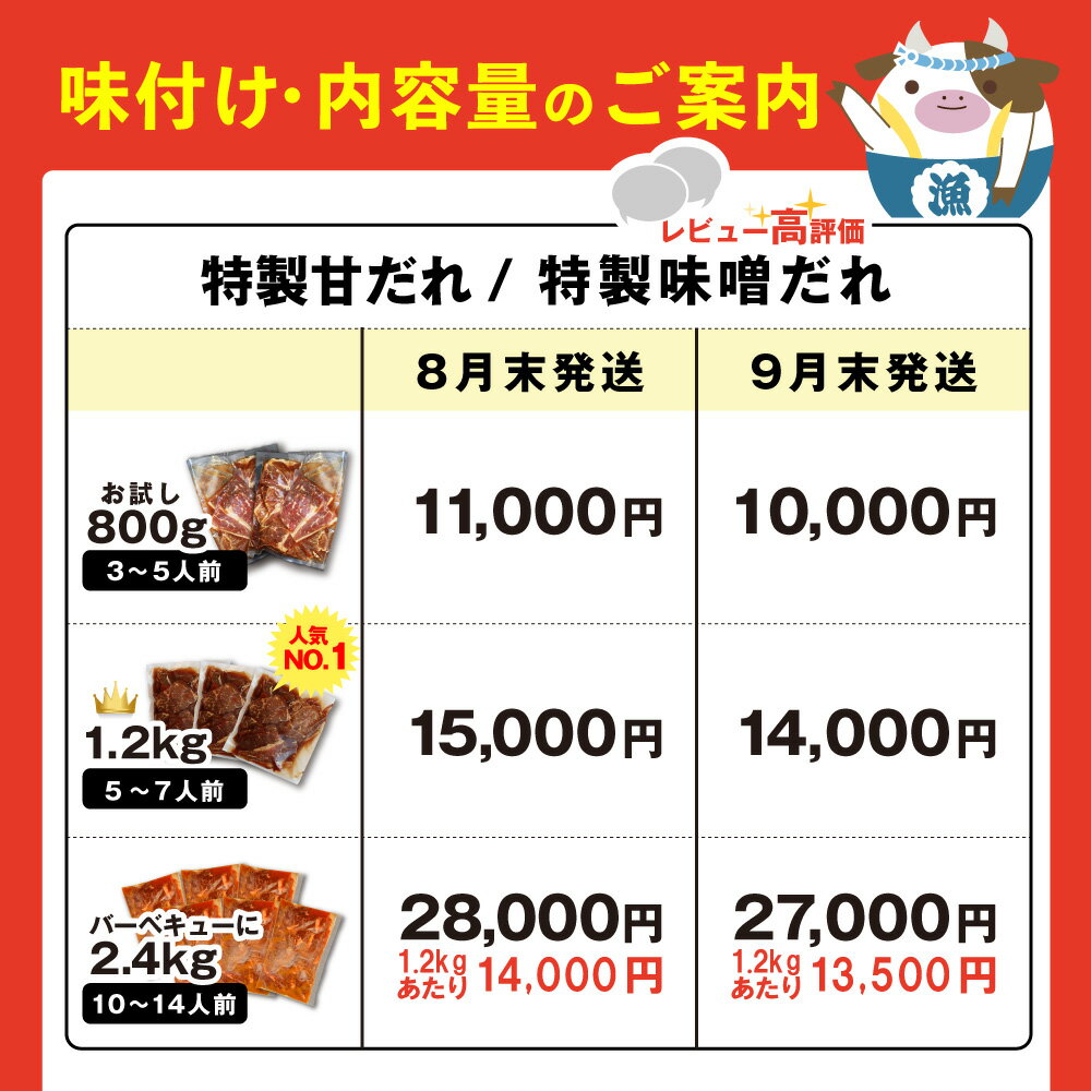 内容量 ■内容量 1.2kgもしくは2.4kg ■種類 特製味噌だれ、特製甘だれ、濃厚つけだれのうちいずれか 産地 北海道別海町産及び北海道産 ※製造安定化のため、地場産品基準の範囲内でわずかに別海牛並みの品質の北海道産の牛肉を調達することがございます。
