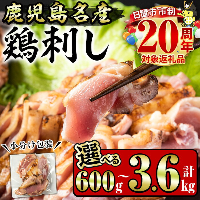 製品仕様 商品名 鹿児島名産 鶏のお刺身 名称 鶏肉 原材料名 鶏肉(モモ肉) 内容量 鶏のお刺身(国産鶏モモ) ・600g:200g×3P ・1kg:200g×5P ・1.2kg:200g×6P ・2.4kg:200g×12P ・3.6kg:200g×18P ※上記5種より1種お選びください。