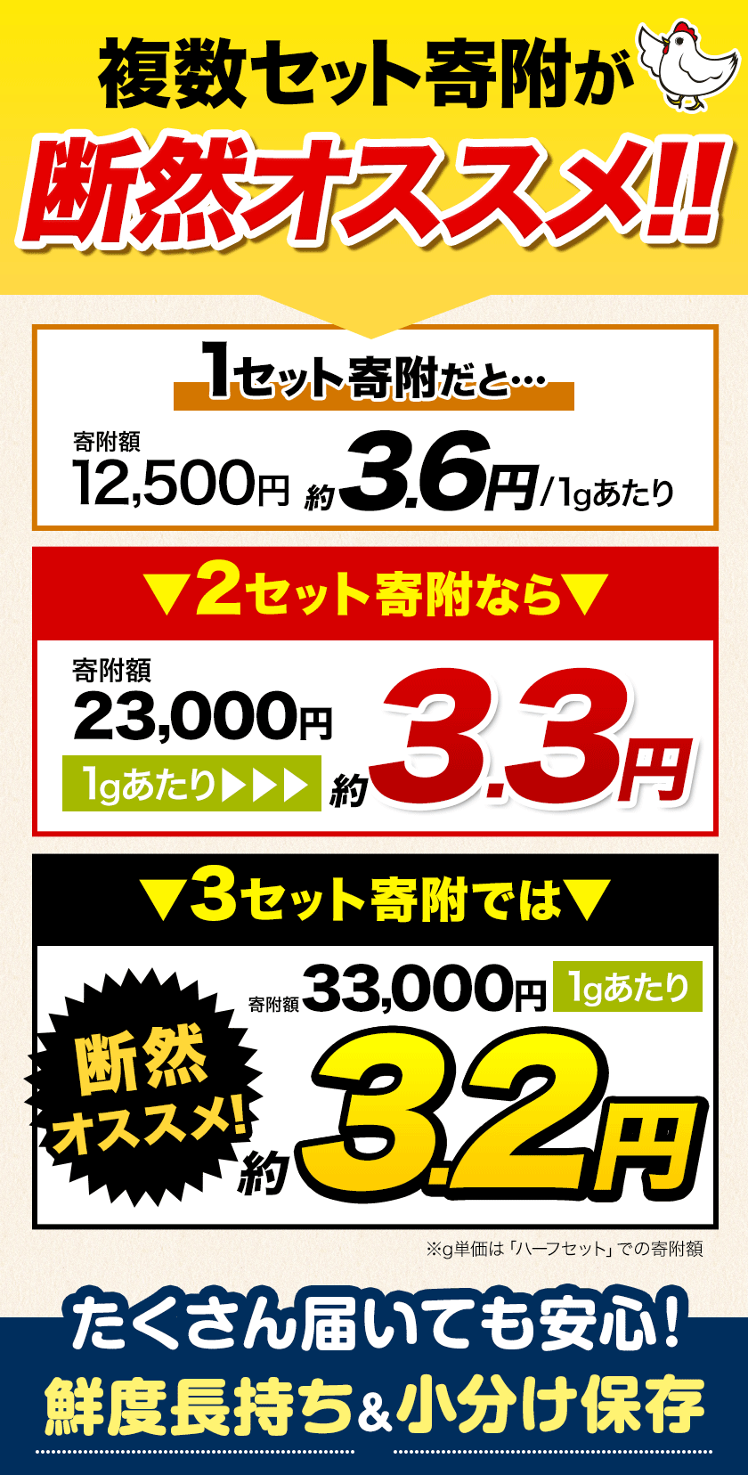 【もも+むねハーフセット(計2種類) 合計3.41kg】は、 12パックで合計重量3.41kgでのお届け 【全パックもも肉セット(計1種類) 合計3.1kg】は、10パックで合計重量3.1kgでのお届け 【全パックむね肉セット(計1種類) 合計3.72kg】は、14パックで合計重量3.72kgでのお届け 賞味期限 外枠に記載 保存方法 -18度以下で冷凍 配送方法 冷凍便でお届けします。