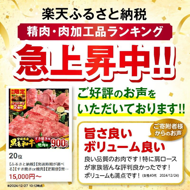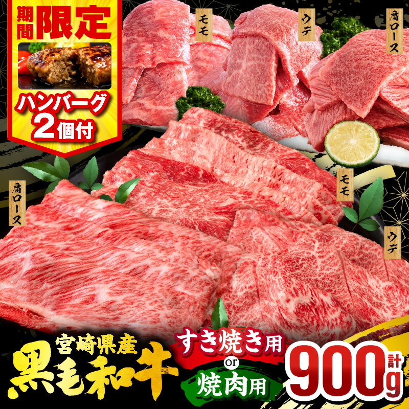 【ふるさと納税】【発送時期が選べる】【すき焼きor焼肉】【定期便】宮崎県産 黒毛和牛 肩ロース・ウデ・モモ 各300g 合計900g+合挽きハンバーグ100g×2個《レビューキャンペーン》
