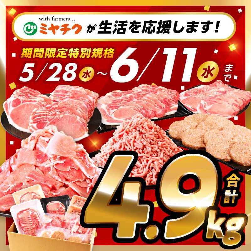 宮崎県産の豚ロース・豚肩ロースが含まれた総重量4.9kgの豚肉バラエティセットです。