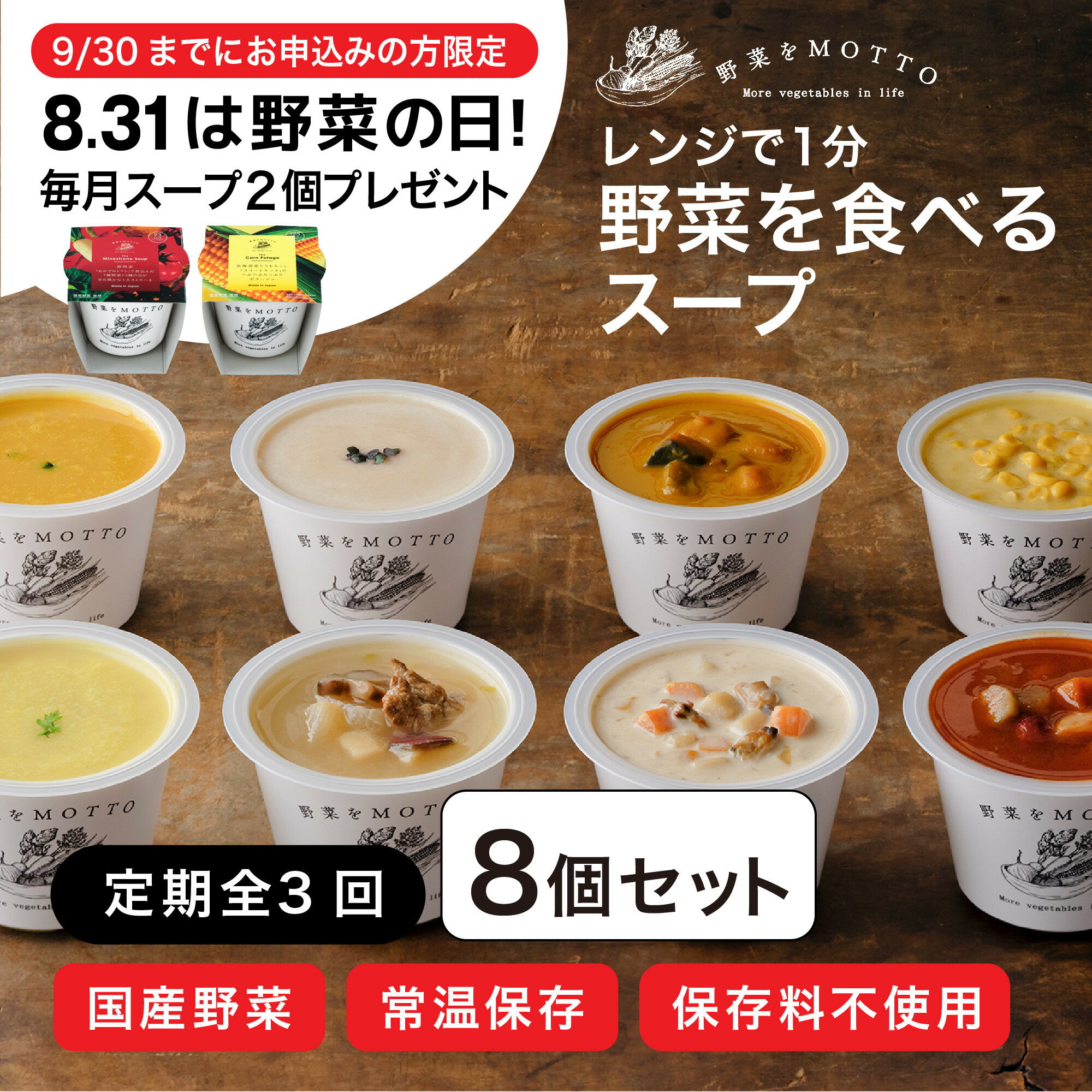 事業者:モンマルシェ株式会社 スープ 惣菜 レトルト インスタント 国産 野菜 加工食品 和風惣菜 雑炊 みそ汁 中華惣菜 点心 セット 詰合せ 食品 おかず 和食 ダイエット 時短 手軽 具だくさん 静岡市 レンジ MOTTO ベジMOTTO 内容量・サイズ等 期間限定 【定期便全3回】野菜をMOTTOスープ8個+2個セット (180g×10個) ミネストローネ・コーンポタージュ・クラムチャウダー・かぼちゃスープ・ボルシチ・ポトフ・和風ごぼう・とん汁 各1個 +ミネストローネ・コーンポタージュ 各1個 ※スープの種類は変更になる場合がございます。