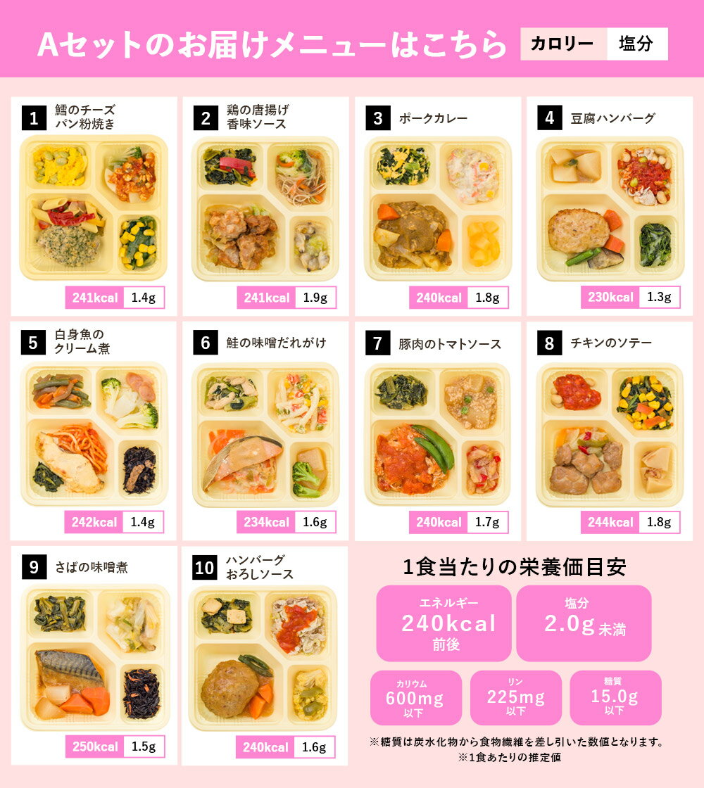 商品名  カロリー・塩分調整食 10食セット  名称  冷凍弁当  原材料名  弁当ラベルに記載(アレルギー情報含む)  内容量  弁当ラベルに記載  賞味期限  弁当ラベルに記載  保存方法  -18℃以下で保存  販売者  株式会社シニアライフクリエイト   東京都港区三田3-12-14ニッテン三田ビル  [関連ワード] 家族 親 両親 母親 父親 母 父 お母さん お父さん 義母 義父 祖母 祖父 お祖母ちゃん お爺ちゃん おばあちゃん おじいちゃん 娘 息子 子供 子ども 妹 弟 姉 兄 旦那 主人 妻 奥さん 嫁 主婦 主夫 親族 親戚 男性 女性 医師 医者 お医者さん 10代 20代 30代 40代 50代 60代 70代 80代 90代 1人暮らし 一人暮らし 独り暮らし 独り 一人 1人 くらし 暮らし 家族暮らし 夜遅く 帰宅 時間が無い 退院後 通院中 通院 退院食 産後 在宅勤務 リモート テレワーク 朝 昼 夕 晩 夜 朝食 昼食 夕食 晩食 夜食 朝飯 昼飯 晩飯 朝ごはん 昼ごはん 夜ごはん ランチ ご飯 ごはん 食事 ワンプレート 離れた 離れている 一緒に住んでいる 仕送り 糖尿病 腎臓病 妊娠中 血糖値 療養食 血圧 血糖値 おかず おかずのみ 惣菜 主菜 副菜 メニュー 豊富 献立 肉 魚 お肉 お魚 野菜 デザート 和洋中 和 洋 中 和食 洋食 中華 バラエティー バラエティ 管理栄養士 栄養士 栄養士監修 栄養 栄養価 バランス バランスの良い食事 食事 栄養バランス カロリーコントロール ヘルシー ダイエット 体重管理 健康 塩分 塩分調整 減塩 減塩食 塩分控えめ 食事制限 通販 宅配 宅配食 冷凍弁当 冷凍 弁当 お弁当 時短 時短調理 炊事軽減 レンチン レンジ調理 レンジ 電子レンジ調理 ネット インターネット 送料無料 配送料無料 国内製造 便利 おすすめ オススメ お勧め 美味しい おいしい 便利 かんたん 簡単 温めるだけ 手軽 手頃 リピート リピーター リピ ストック Aセット Bセット Cセット Dセット 肉セット 魚セット 肉Aセット 肉Bセット 魚Aセット 魚Bセット 健康直球便 シニアライフクリエイト>Aセットの栄養成分はこちら< >Bセットの栄養成分はこちら< >Cセットの栄養成分はこちら< >Dセットの栄養成分はこちら< >Eセットの栄養成分はこちら< >肉Aセットの栄養成分はこちら< >肉Bセットの栄養成分はこちら< >魚Aセットの栄養成分はこちら< >魚Bセットの栄養成分はこちら< 商品力向上の為、お客様のご意見を取り入れメニュー変更を行う場合があり、ご注文時とお届け時のメニュー内容が一部変更となる場合がございます。