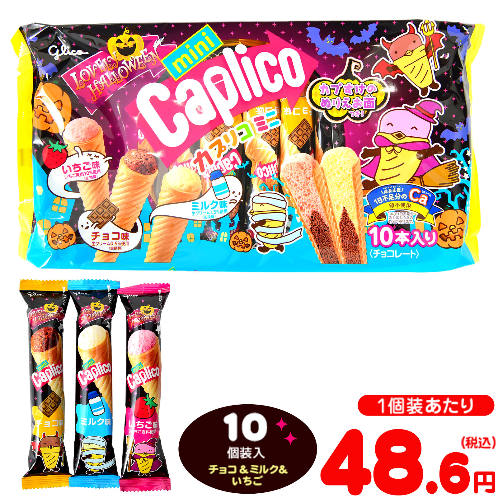 ハロウィンのイベント・ホームパーティーに!ハロウィン限定パッケージのカプリコミニ♪いちご、ミルク、チョコ味のフワフワなエアチョコとサクサクのコーンのハーモニーで定番人気の美味しさ!ハロウィン配布用にもおやつ用にもオススメです。