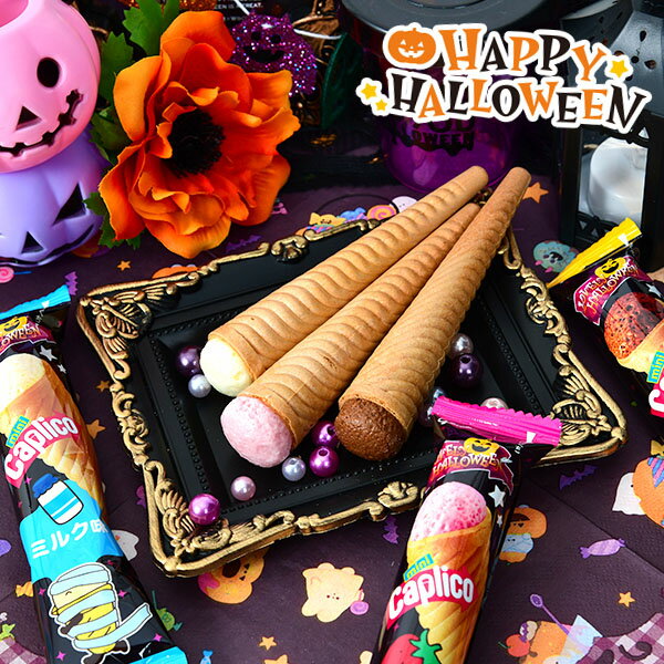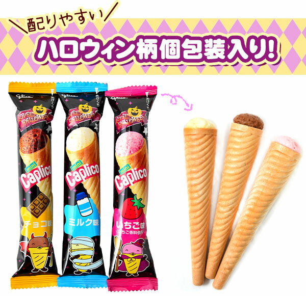 ハロウィンのイベント・ホームパーティーに!ハロウィン限定パッケージのカプリコミニ♪いちご、ミルク、チョコ味のフワフワなエアチョコとサクサクのコーンのハーモニーで定番人気の美味しさ!ハロウィン配布用にもおやつ用にもオススメです。