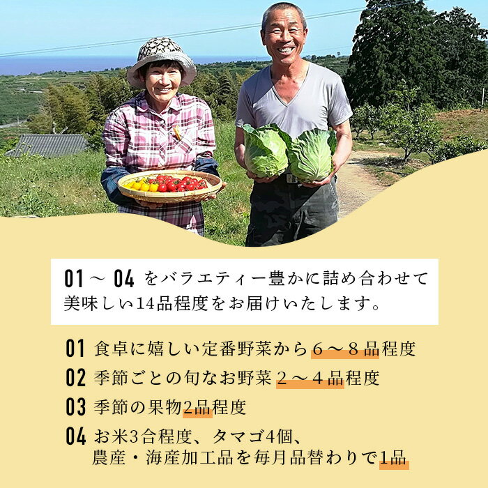 食卓に嬉しい定番野菜から7品目程度、季節ごとの旬なお野菜2品目程度、季節の果物2品目程度、お米3合程度、タマゴ4個、農産・海産加工品を毎月品替わりで1品目、をバラエティー豊かに詰め合わせています。